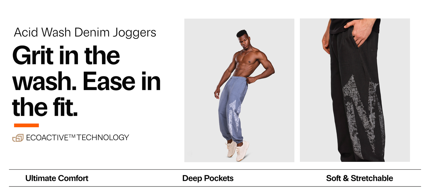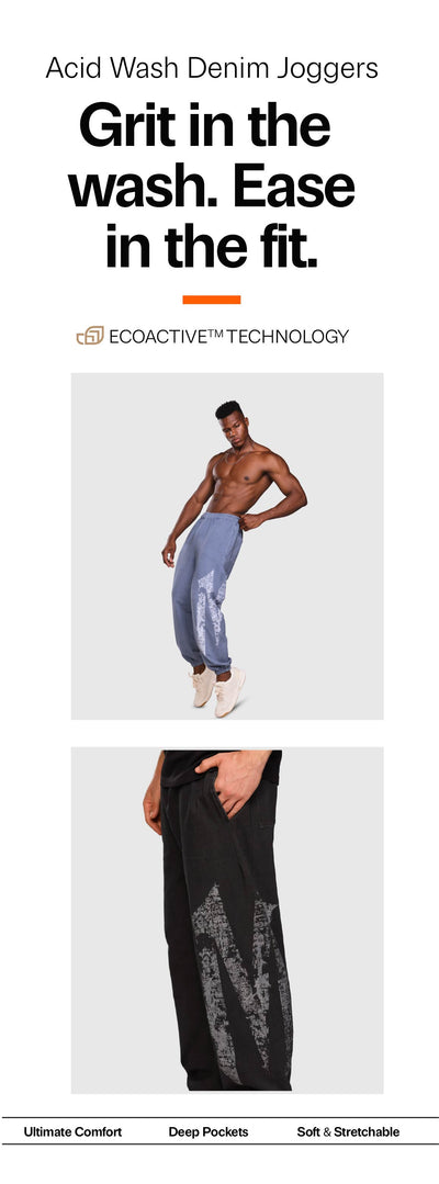 Crafted from a premium fabric blend, these joggers combine denim’s rugged appeal with unmatched stretch and softness, finished in bold acid-wash