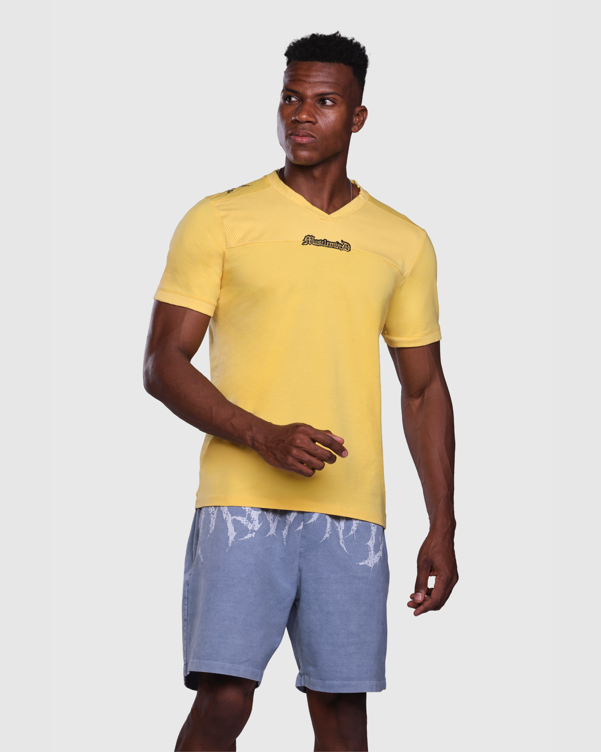 Featuring straight side seam pockets for a clean look and a top-stitched square back pocket with contrast 'Musclemind' embroidery for detail.