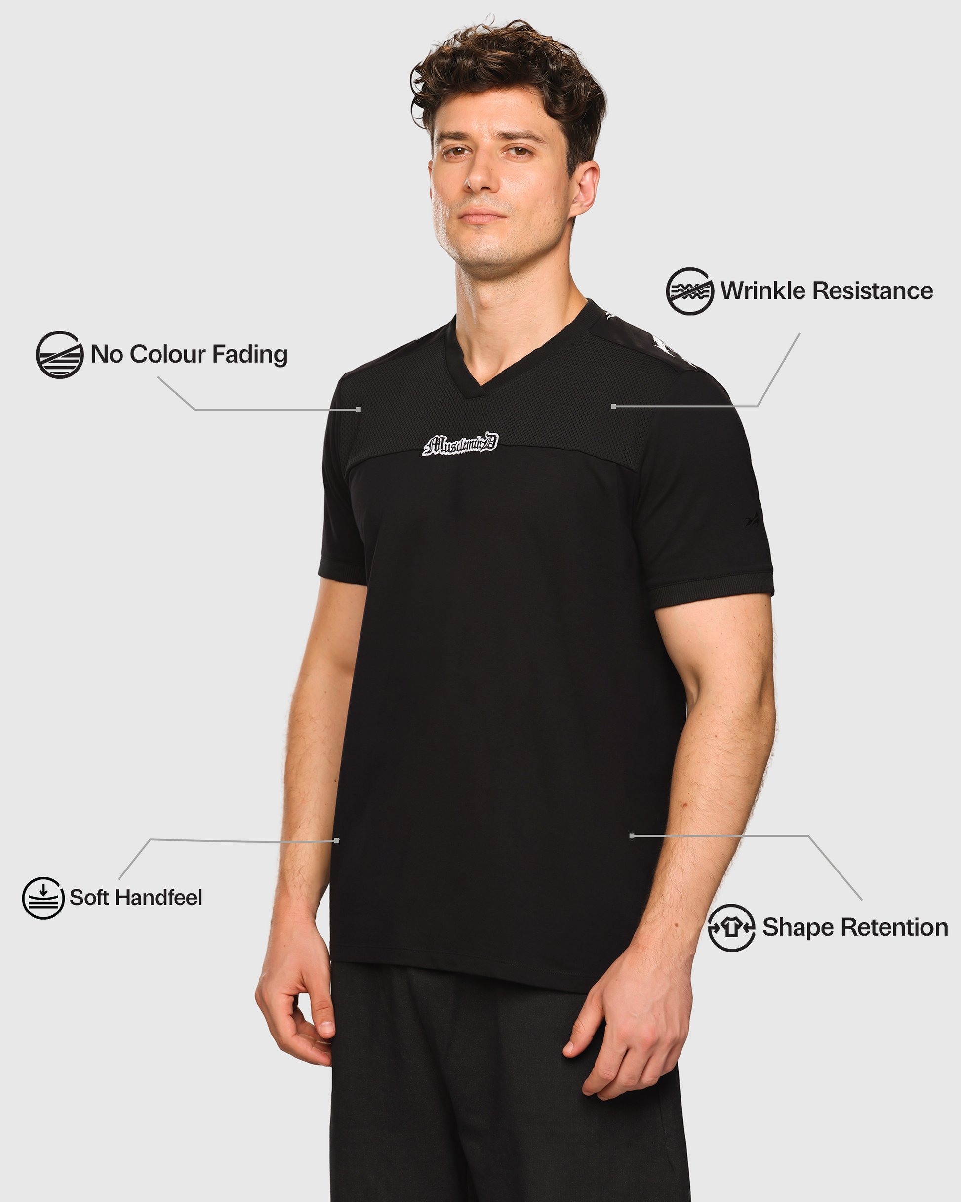 A sharp V-neck with ribs ensures a refined fit, while the self-fabric neck tape enhances durability, comfort, and lasting premium wear.